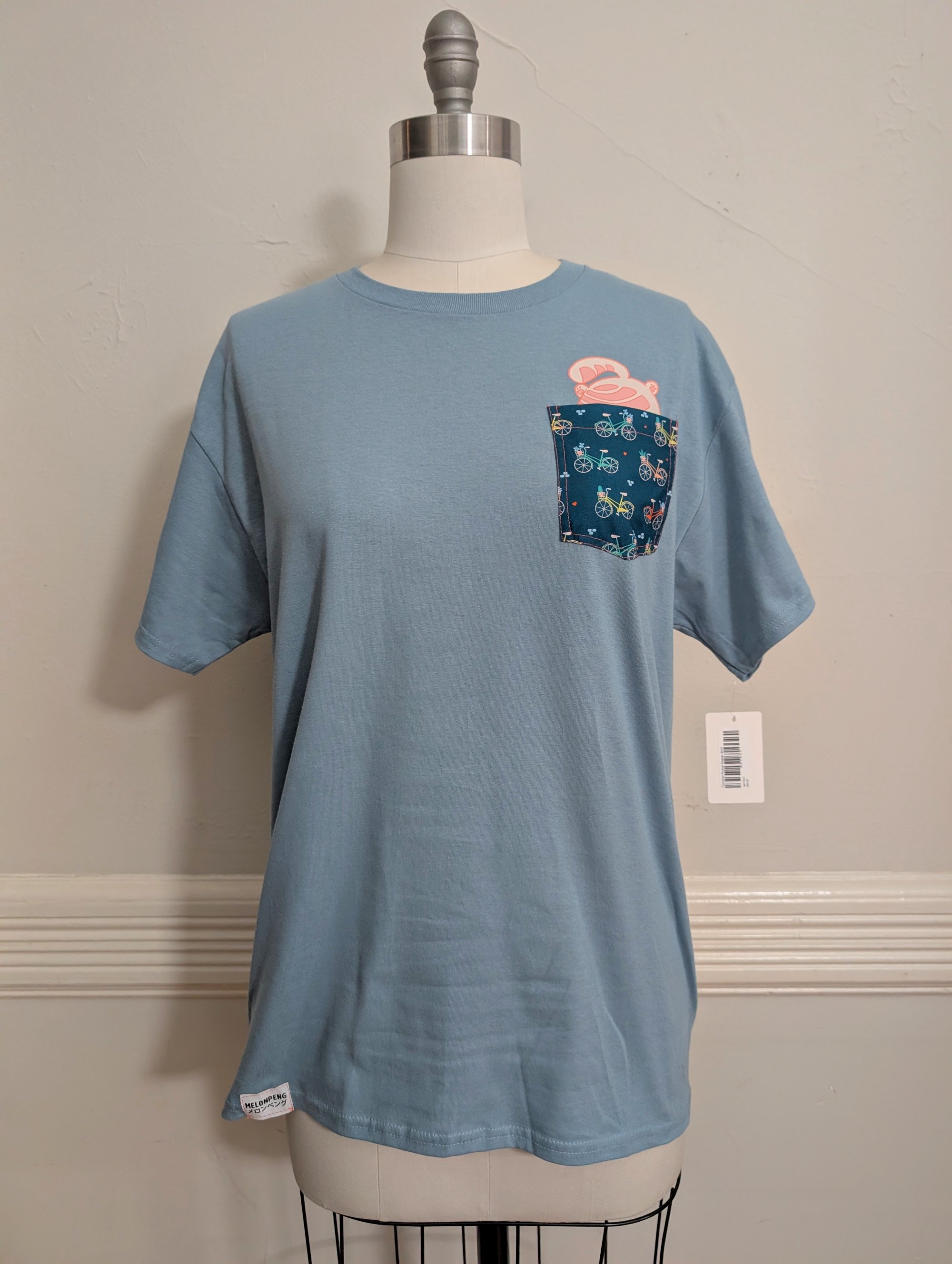Unisex style: Cute full illustration hidden under a real physical pocket! Comes in natural cotton or dusty blue!