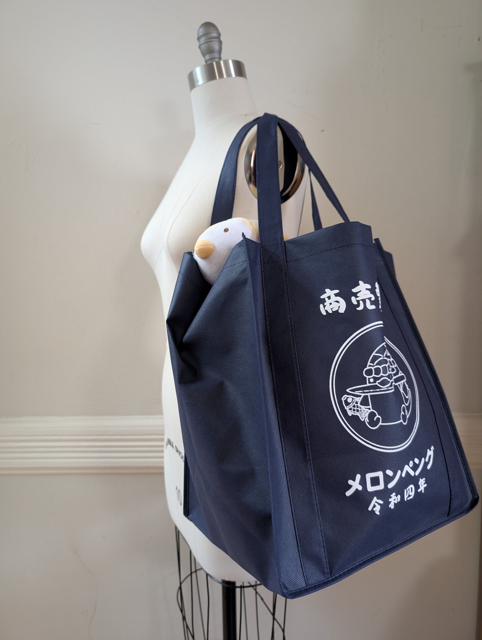 This large eco tote features our newest print inspired by traditional maekake. The top phrase is "Shobai Bansho" which is a yojijukugo that manifests business success, and the bottom is "Melonpeng" in our katakana and our establishment year. Our little friend may look like he's about to butcher a fish... but that's really a taiyaki.
